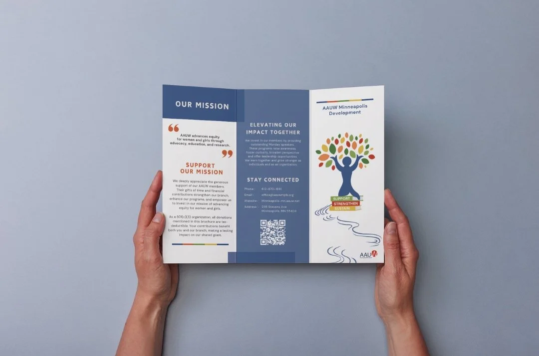 AAUW Minneapolis needed a professional, visually engaging brochure to effectively communicate their mission, programs, and impact. The goal was to create a clear, compelling, and accessible design that would help recruit members and encourage community involvement.